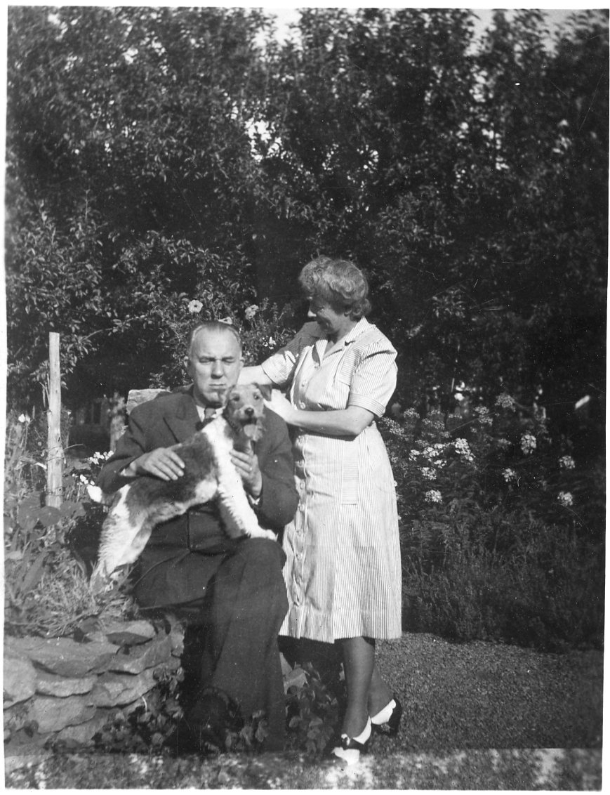 En man sitter på en stol i trädgård med en terrier i knät, en kvinna står intill honom med en arm på hans axel.