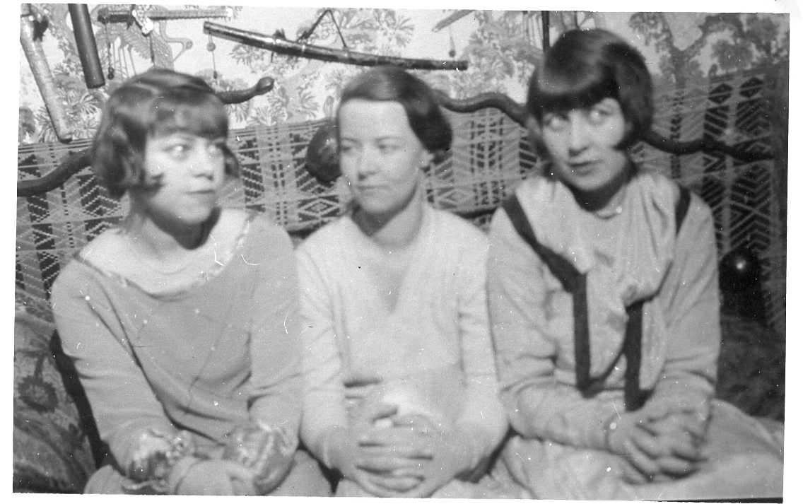 Tre sittande unga kvinnor. Kvinnan i mitten är Astrid Malmborg.