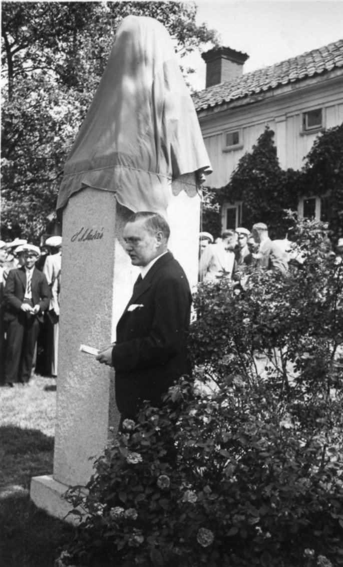 En man håller ett tal vid den täckta Andréebysten på slänten framför framför Grenna Hembygdsgård/Andréemuseum). Mannen är Felix Hamrin, landshövdning i Jönköpings län.