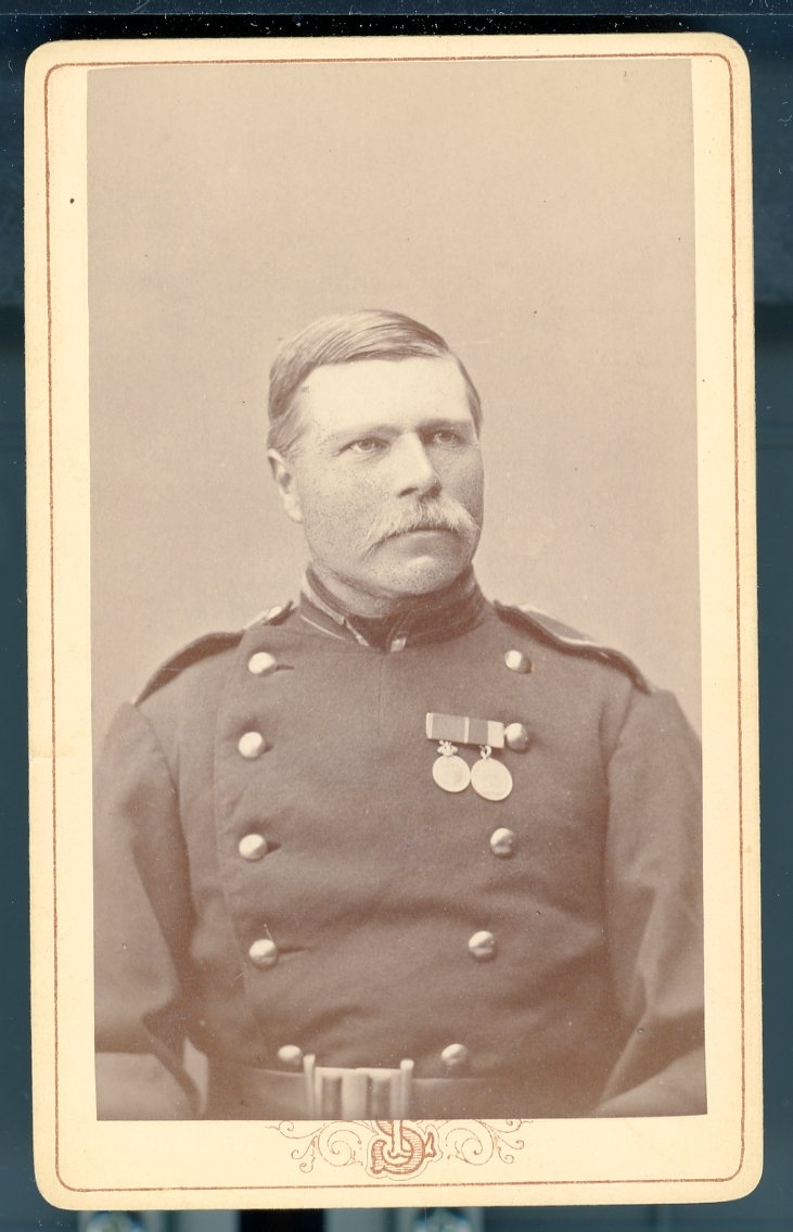 Kabinettsfotografi: korpral Gräns i uniform med medaljer på bröstet.