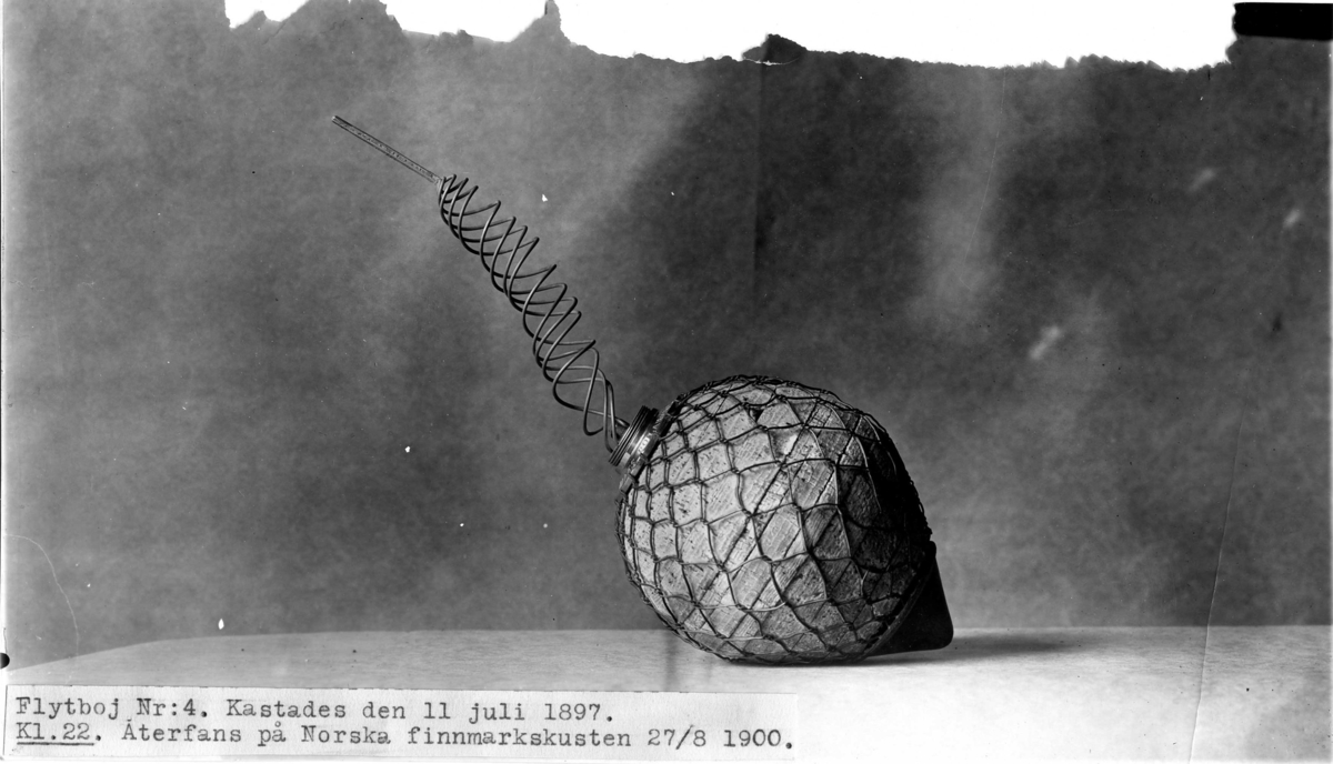"Flytboj N:r 4. Kastades den 11 juli 1897. kl 22. Återfanns på Norska finnmarkskusten 27/8 1900."