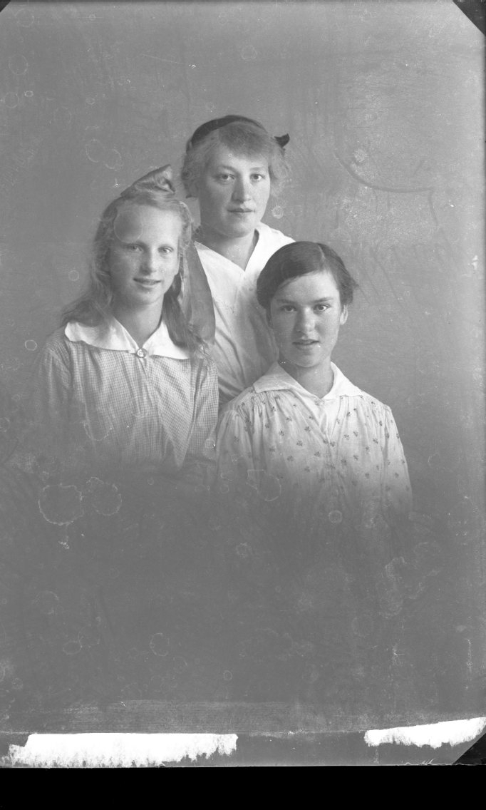 Gruppbild med en kvinna och två flickor. Kvinnan i mitten är möjligen Ester Johansson i Reaby.