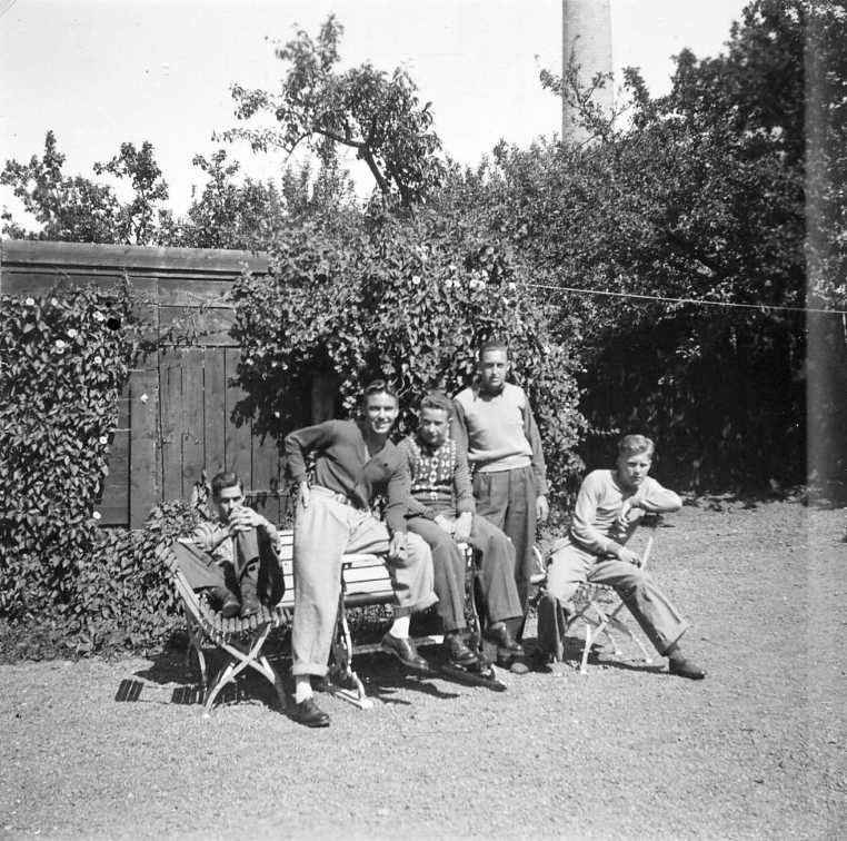 Fem unga män vid trädgårdsmöbler på en gård med grusplan. Möjligen Gränna mejeris skorsten i bakgrunden.