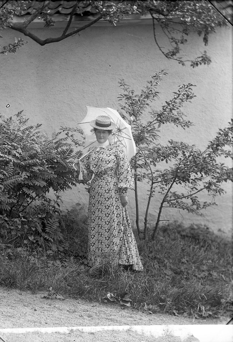 Porträtt av Hilda Rosenborg. Hon står med ett parasoll mot en husvägg, möjligen vid Bergsgatan 58. Hon bär en stråhatt och en mönstrad fotsid klänning.