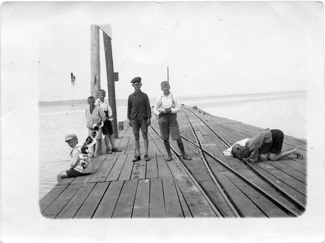 Sju pojkar på en brygga med järnvägsspår i plankorna. Två pojkar sitter på knä och kikar ner i spåren.