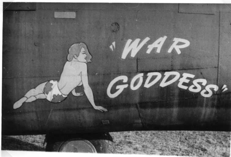 Målning på ett amerikanskt bombplan föreställande en sittande kvinna bakifrån, med huvudet i profil, som lutar sig framåt på sina armar, iförd endast bikinibyxor. Bredvid målad text: "War Goddess".