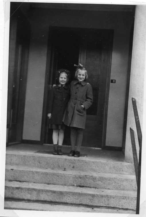 Två flickor, med armen om varandras axlar, står utanför en port.