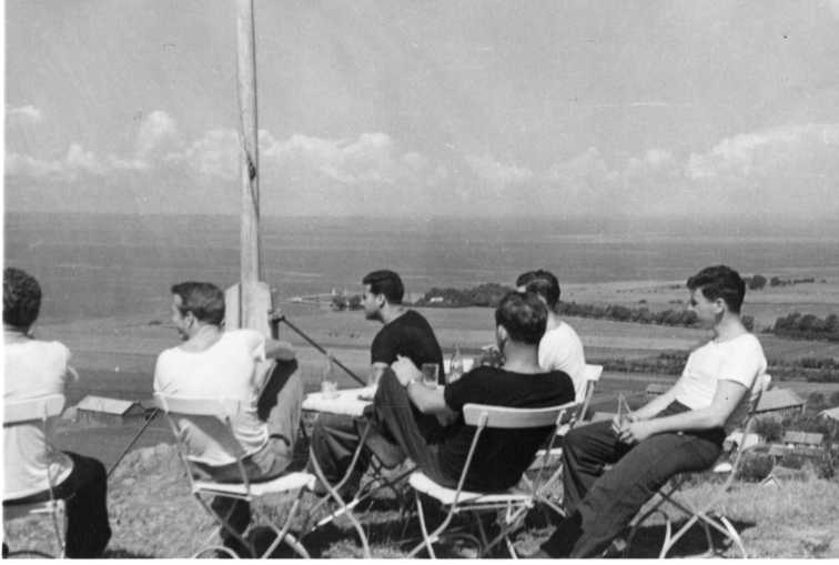 Titel: En grupp män sitter vid kafébord, vid en flaggstång, på Grännaberget med utsikt mot Gränna hamn. De sitter sannolikt vid friluftsmuseet och kaffestugan.