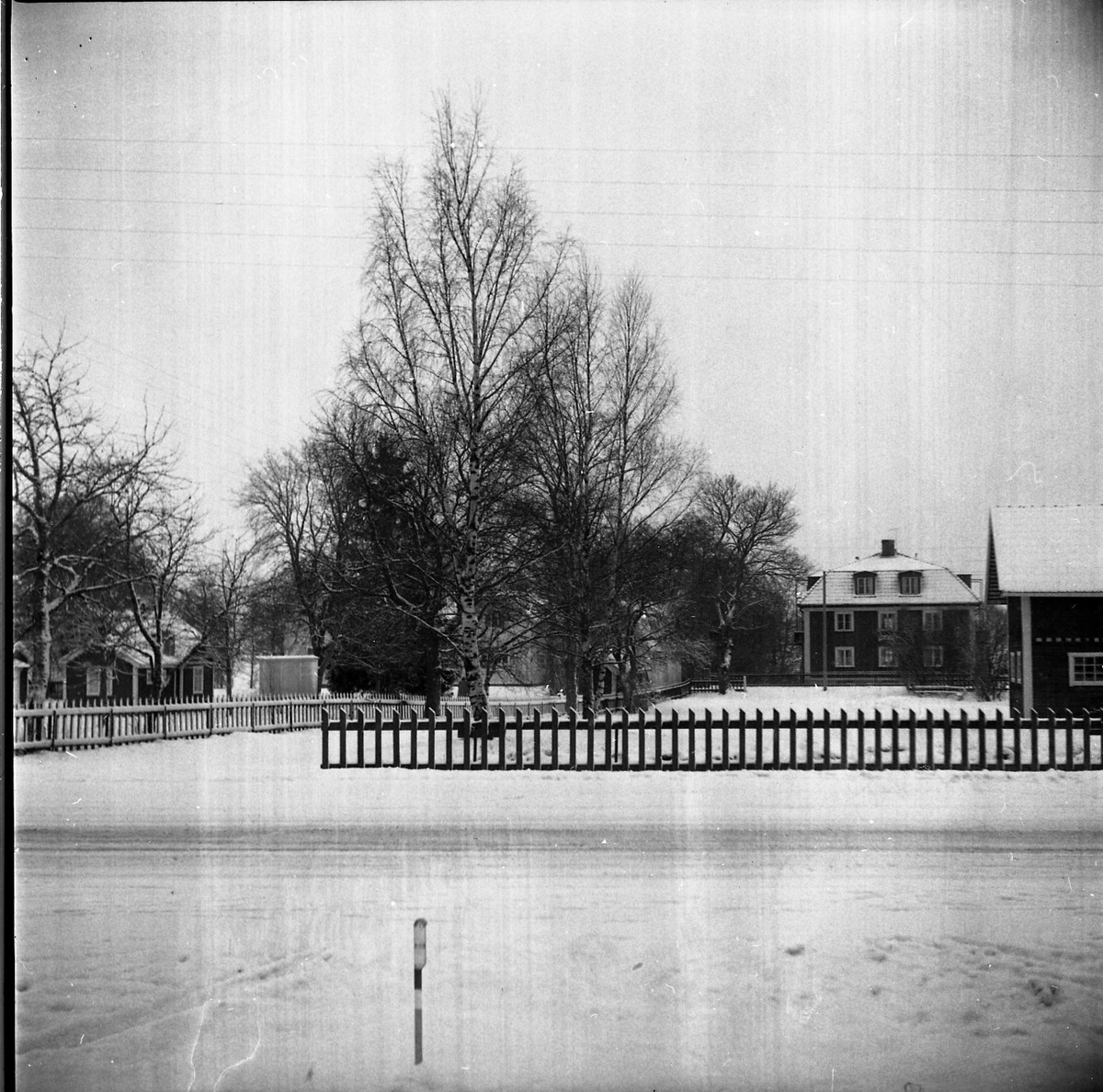 Längst en snötäckt väg sträcker sig ett staket. Bortanför staketet står avlövade träd och hus med snötäckta tak.