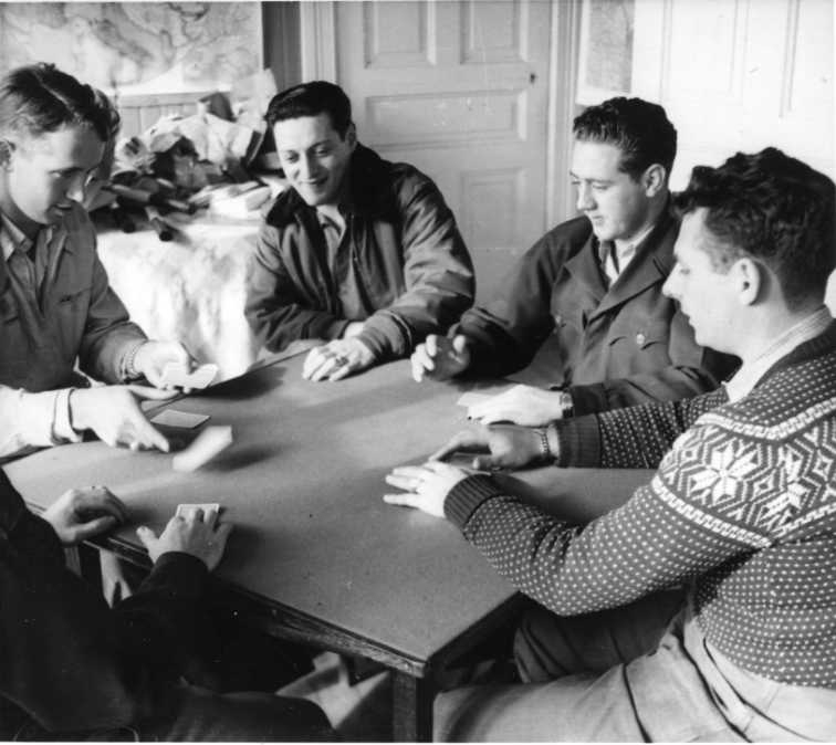 Fem män sitter runt ett fyrkantig bord i ett rum och spelar kort. Mannen till vänster är möjligen S Miller. På väggen bakom dem skymtar en karta över Europa.