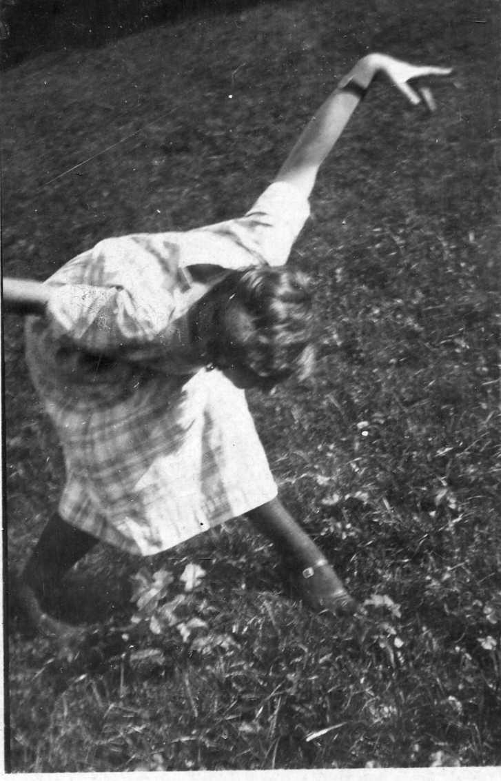 En kvinna i rutig klänning står på en sommaräng och spexar med kroppen.