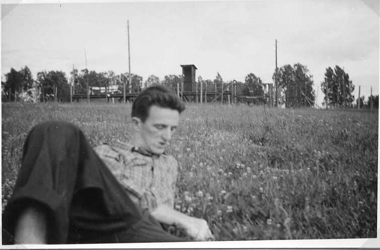 En ung man ligger på en äng. I bakgrunden en inhägnad med högt stängsel.