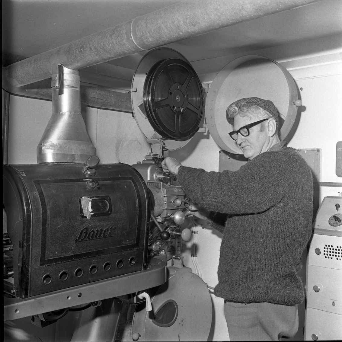 En i tjock tröja, rutig keps och glasögon står vid en bioprojektor.