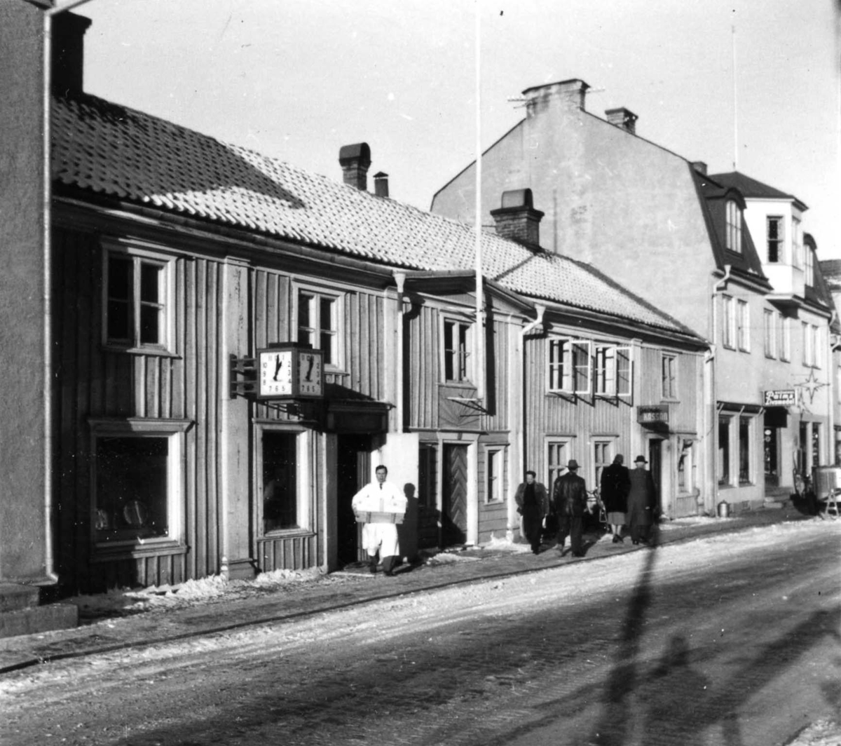 Fotografi av Brahegatan 51. En man i vit rock med trälåda i famnen lämnar en butik ovanför vars dörr det sitter en stor väggklocka. Ovanför dörren till vänster sitter en skylt för "Jordbrukskassan".