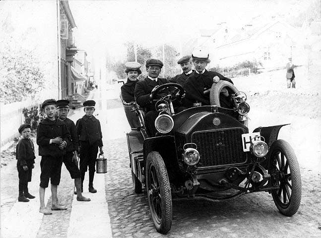 En bil (cabriolet) står parkerad vid Brahegatan i Gränna nedanför nuvarande Braheparken, riktning söderut. I bilen sitter en man och en kvinna fram - möjligen Edit Västberg-Malmberg från Vimmerby - och i baksätet likaså. På trottoaren intill dem - dubbla rader med borgmästarsten - står fyra små pojkar.