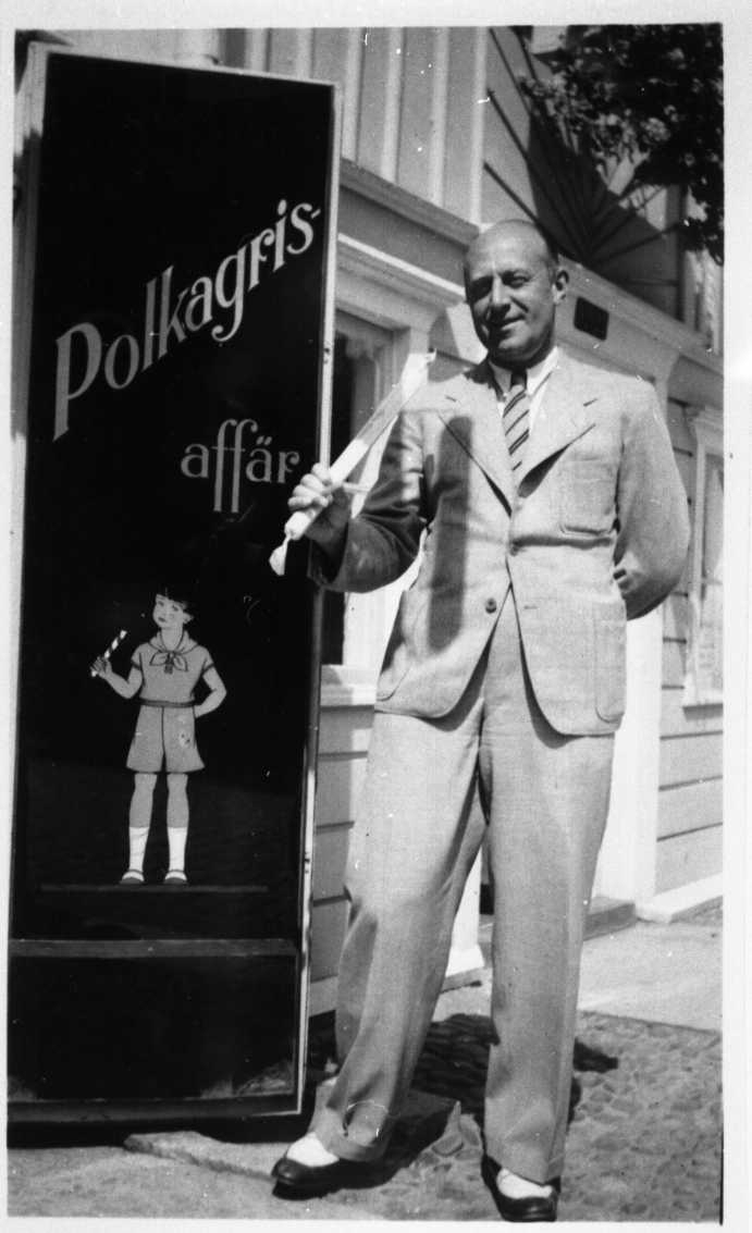 En okänd välklädd man med en stor polkagrisstång utanför en polkagrisbutik. Butiken har en skylt med texten "Polkagrisaffär" och barn med en polkagris.
