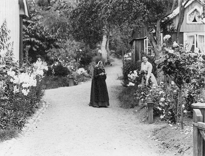 På uppfarten mellan Bergsgatan 22 och 20 i Gränna. I mitten står mor Maja Allard och till höger, möjligen med blommor i famnen, dottern Anna Zander.