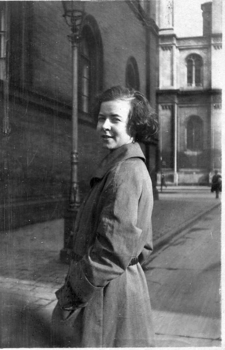 En kvinna i kappa, vänd mot fotografen. Hon befinner sig i stadsmiljö.