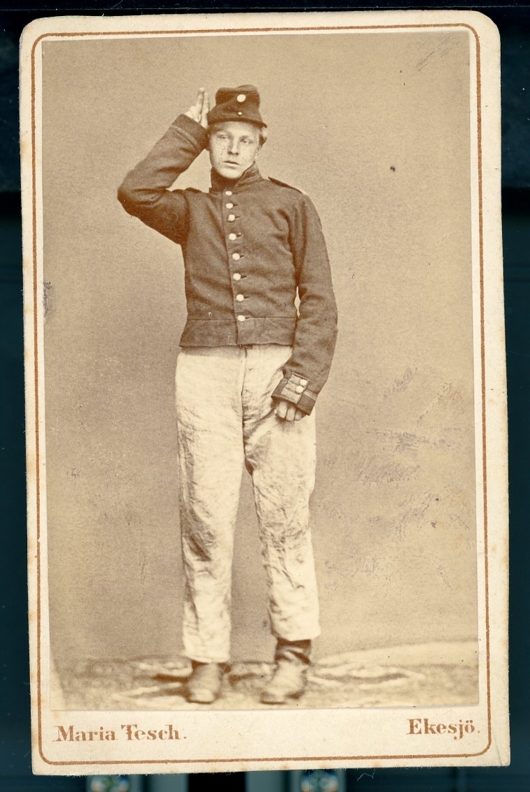 Kabinettsfotografi: Bror Andreas de Verdier, helfigur av en ung man ljusa byxor, uniforms- rock och -hatt. Verkar spexa, en aningen tafatt pose. Han gör en variant av honnör med pek- och långfingret utsträckt vid sidan av huvudet