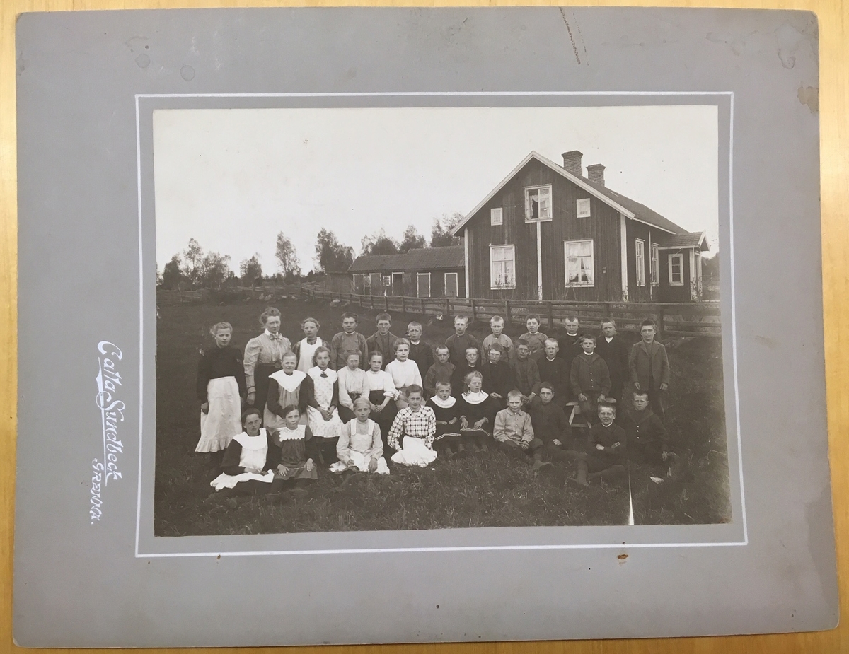 Folkskolelärarinnan Charlotta Kristina Johansson med skolbarn, sittande och stående på en äng vid sidan av Mörstorps skola.