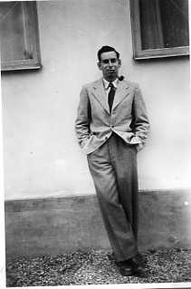 En ung man i kostym med pipa i mungipan står avslappnat med händer i byxfickorna lutad mot en husvägg. Troligen R A Wermeyer.