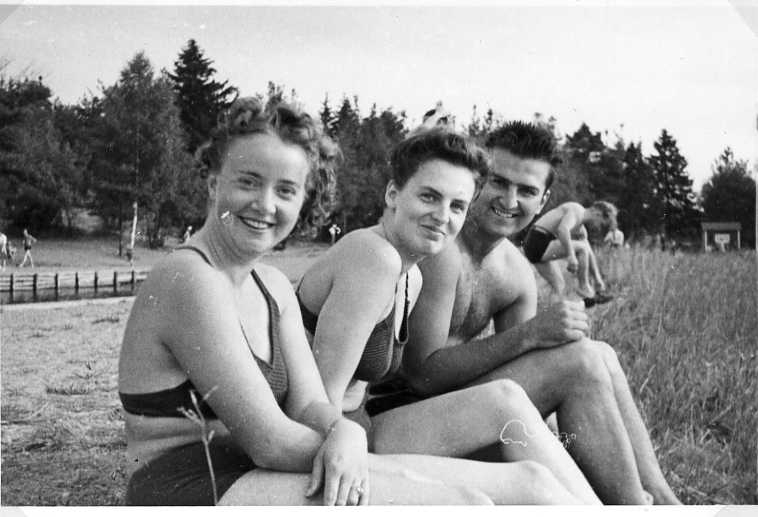 Två unga kvinnor och en ung man i badkläder, förmodligen vid en badstrand. Mannen är sannolikt E A Simi.