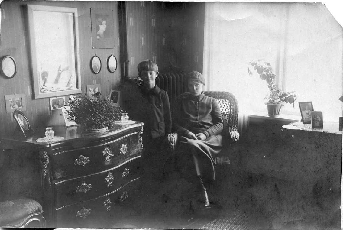 En pojke står intill sin mamma som sitter en rottingstol framför ett fönster. På väggen till vänster om pojken hänger ett porträtt av hans storasyster.