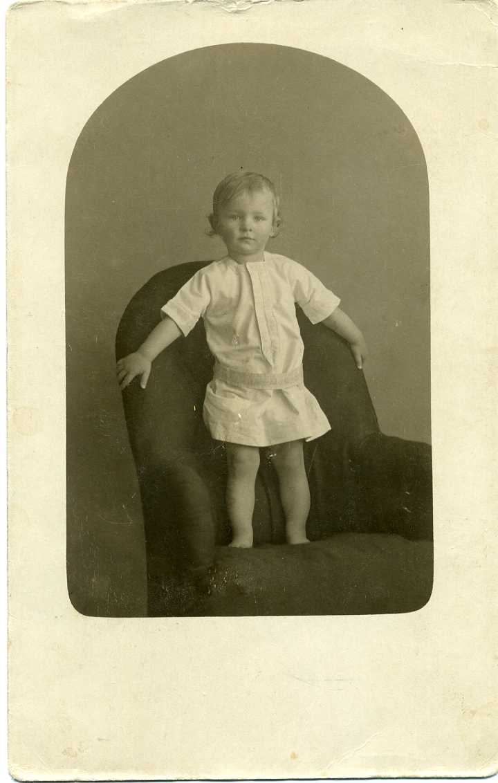 Porträtt av en liten pojke i ljus särk som står i en fåtölj. Vykort.