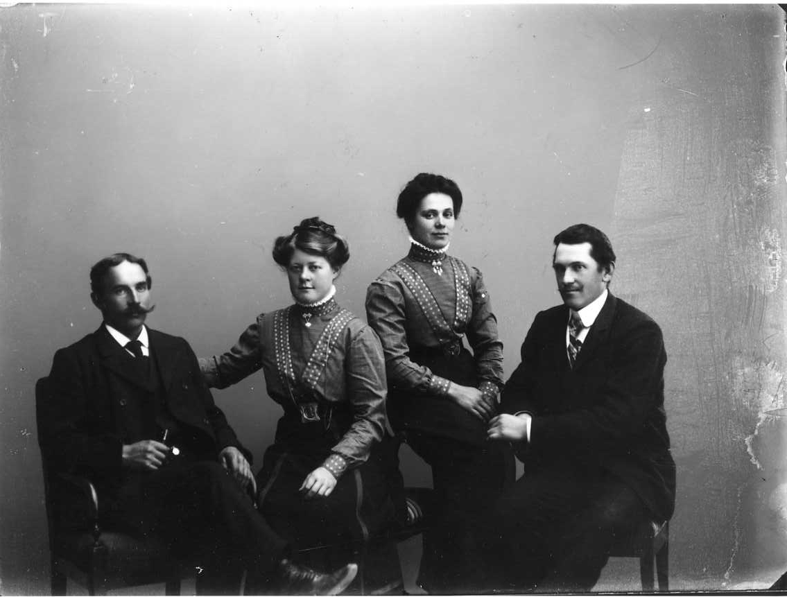 Gruppbild med två unga kvinnor sittande mellan två män. Kvinnorna är klädda på samma sätt med mörk kjol och rutig blus med prickiga band som löper från över axel snett ned mot naveln. Männen bär kostym och kravatt. Kvinnan till vänster är Hanna Johansson från Örserum.