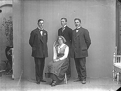 En kvinna i folkdräkt sitter på en stol med tre män stående bakom henne.