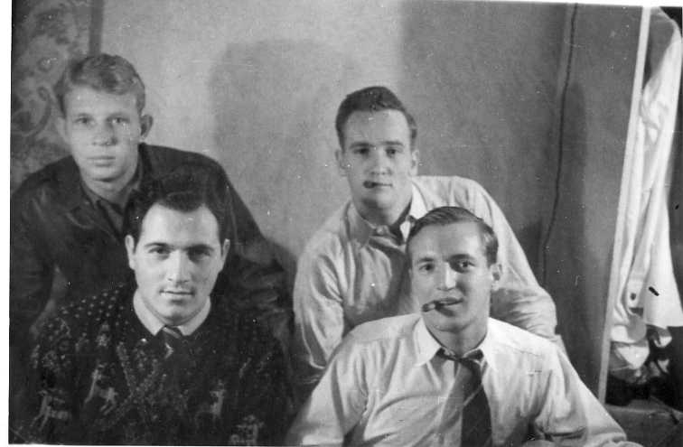 Gruppbild med fyra unga män sittande i ett rum. Till vänster L T Sanford och troligen M Marchese. De två oidentifierade till höger har en cigarr i munnen.