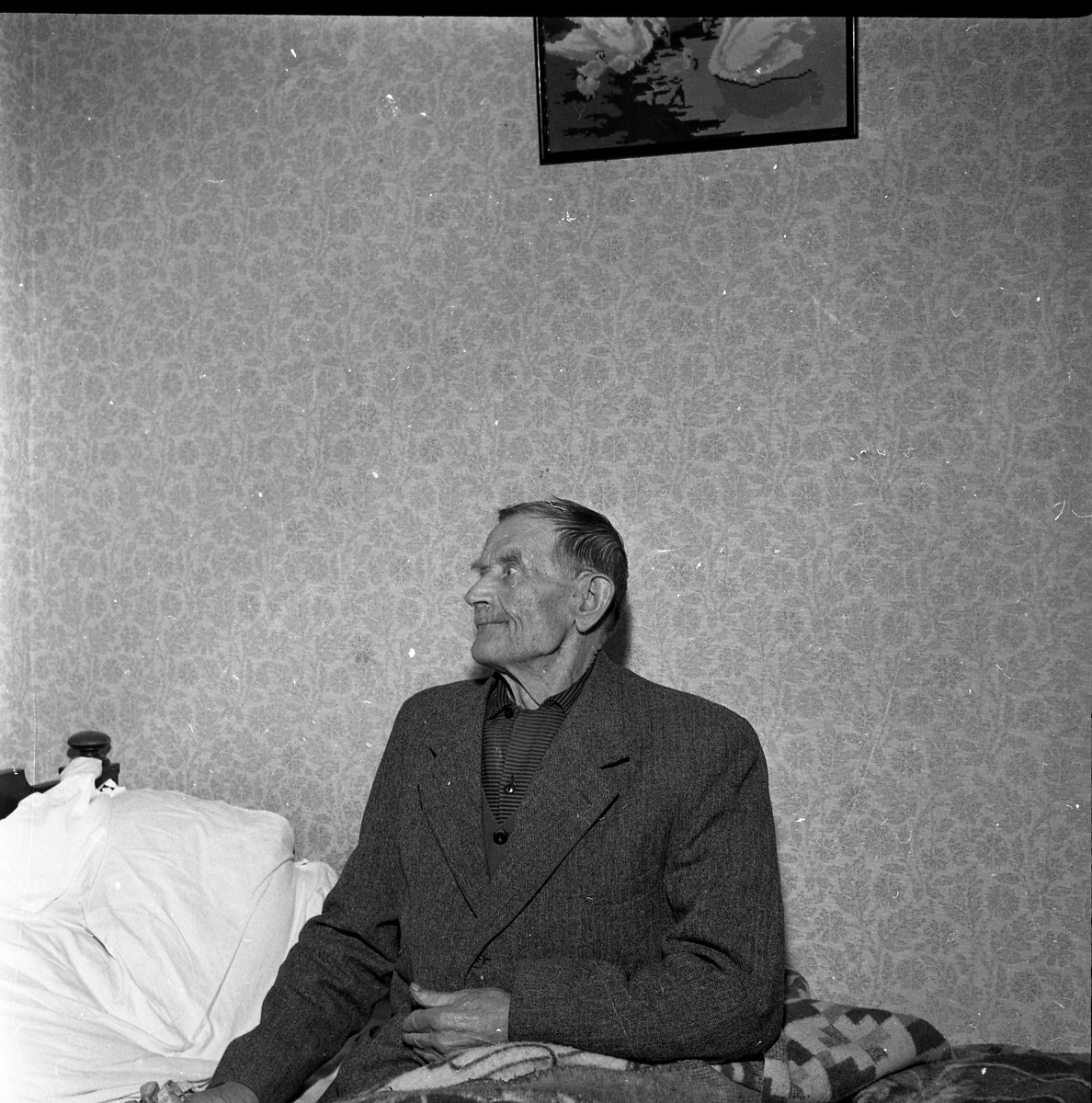 Porträtt av en äldre man som sitter i en säng. Han har kostym på sig.