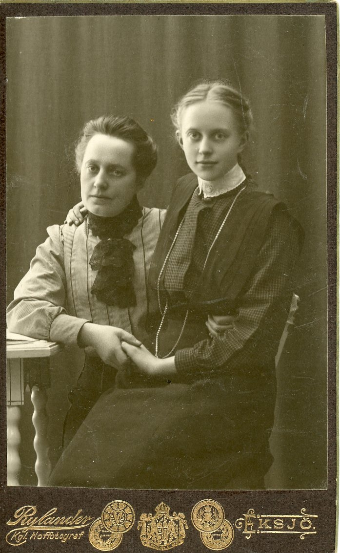 Porträtt av en flicka i tonåren som sitter i en äldre kvinnas knä, de håller varandras händer. Troligen släkt.