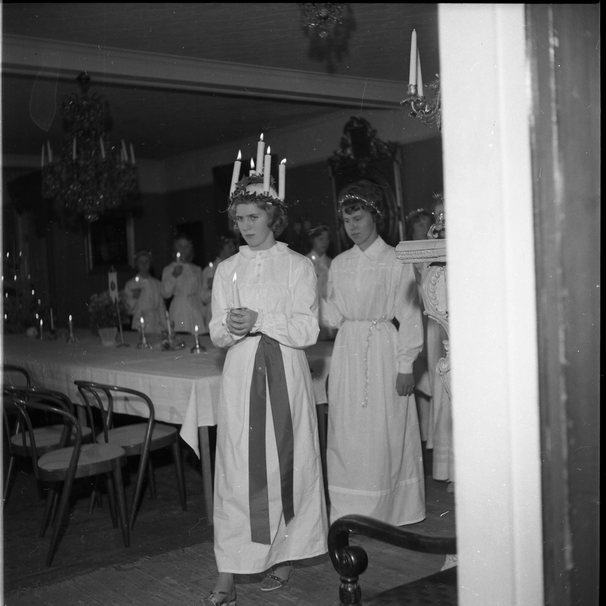 Ett luciatåg går längst ett bord i en stor sal. De har levande ljus i händerna och lucian har en ljuskrona. Lucian har ett rött sidenband runt midjan och tärnorna har glitter.