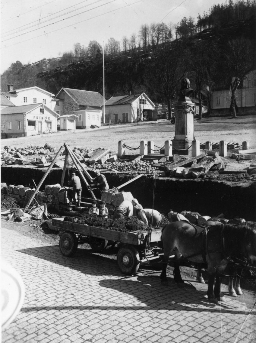 Arbete vid torgmuren nedanför Brahe-bysten i samband med att gatan får ny beläggning och breddas. På gatan står en hästdragen flakvagn med jord, två pojkar står och tittar på. Till vänster en fyrbent vinschkran.