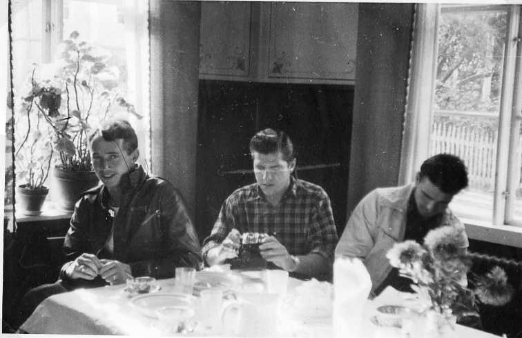 Tre unga män sitter runt ett matbord med djupa tallrikar och dricksglas. I mitten i rutig skjorta sitter L R Green och pysslar med en kamera.