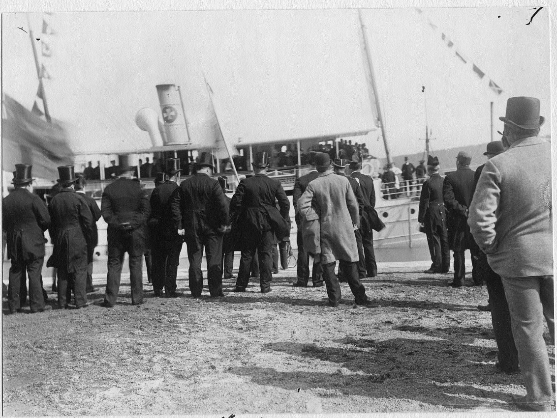 Ångbåten Motala Express på väg att lägga till vid hamnen Gränna. Ombord finns kung Oscar II. Män med höga hattar står på kajen.