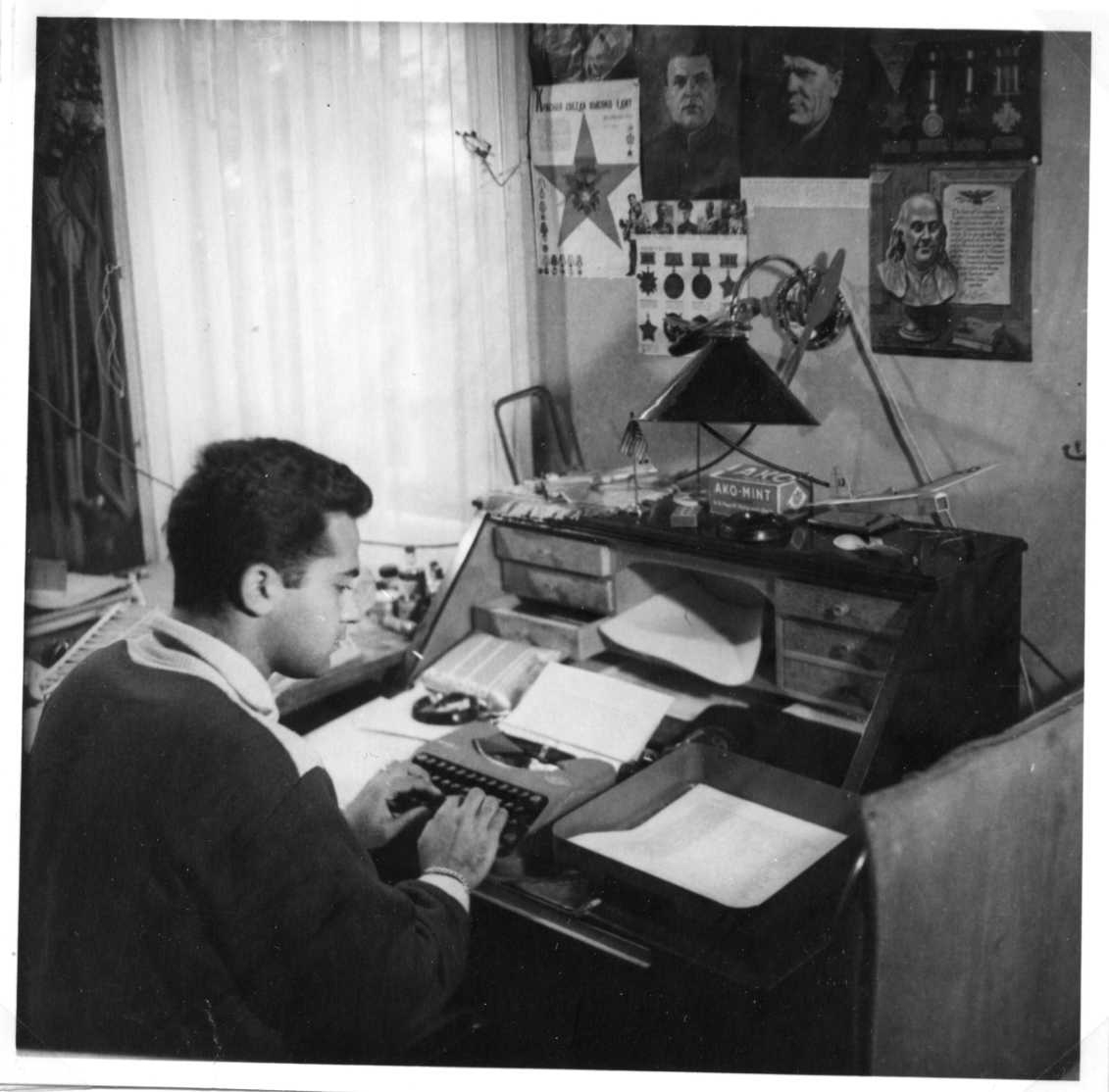 En ung man vid en sekretär och skriver på en skrivmaskin. På väggen framför honom porträttbilder på män och avbildningar av diverser ordnar och utmärkelser.
