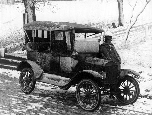 En nedisad bil står på Brahegatan i Gränna vid torgets södra uppfart. En man i rock, halsduk och mössa med öronlappar står på andra sidan bilen, lutad mot densamma. Han har en liten snöhög på mössan.