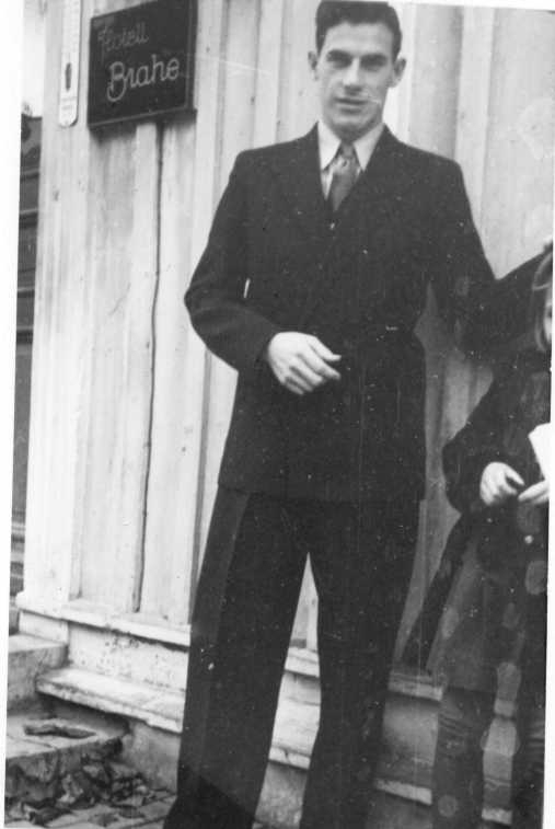 En man i mörk kostym står utanför Hotell Brahe i Gränna. Intill och delvis utanför bild står en liten flicka på vars huvud mannen håller sin hand.