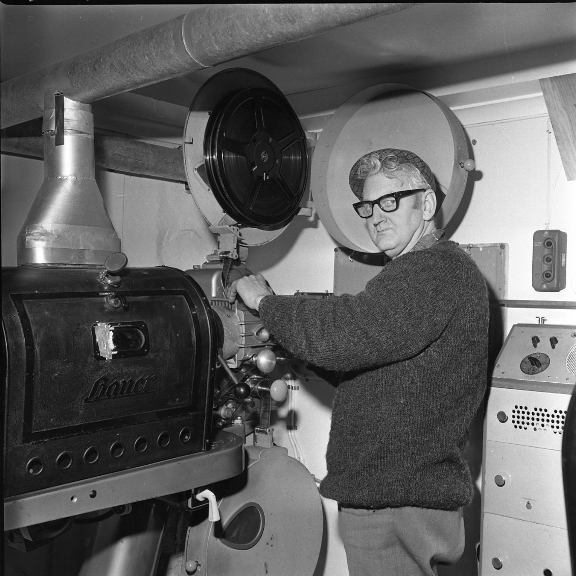 En i tjock tröja, rutig keps och glasögon står vid en bioprojektor.