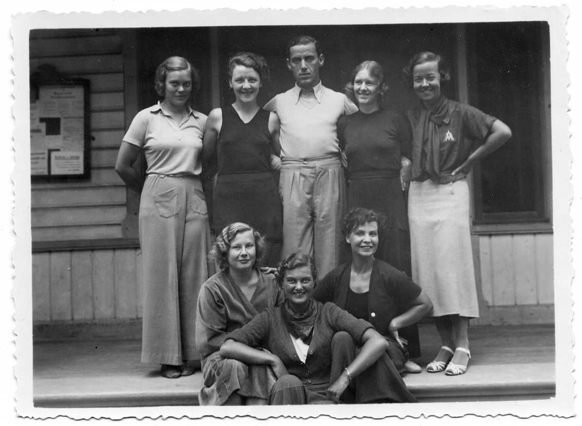 En grupp med sju sommarklädda kvinnor och en man som står på en veranda