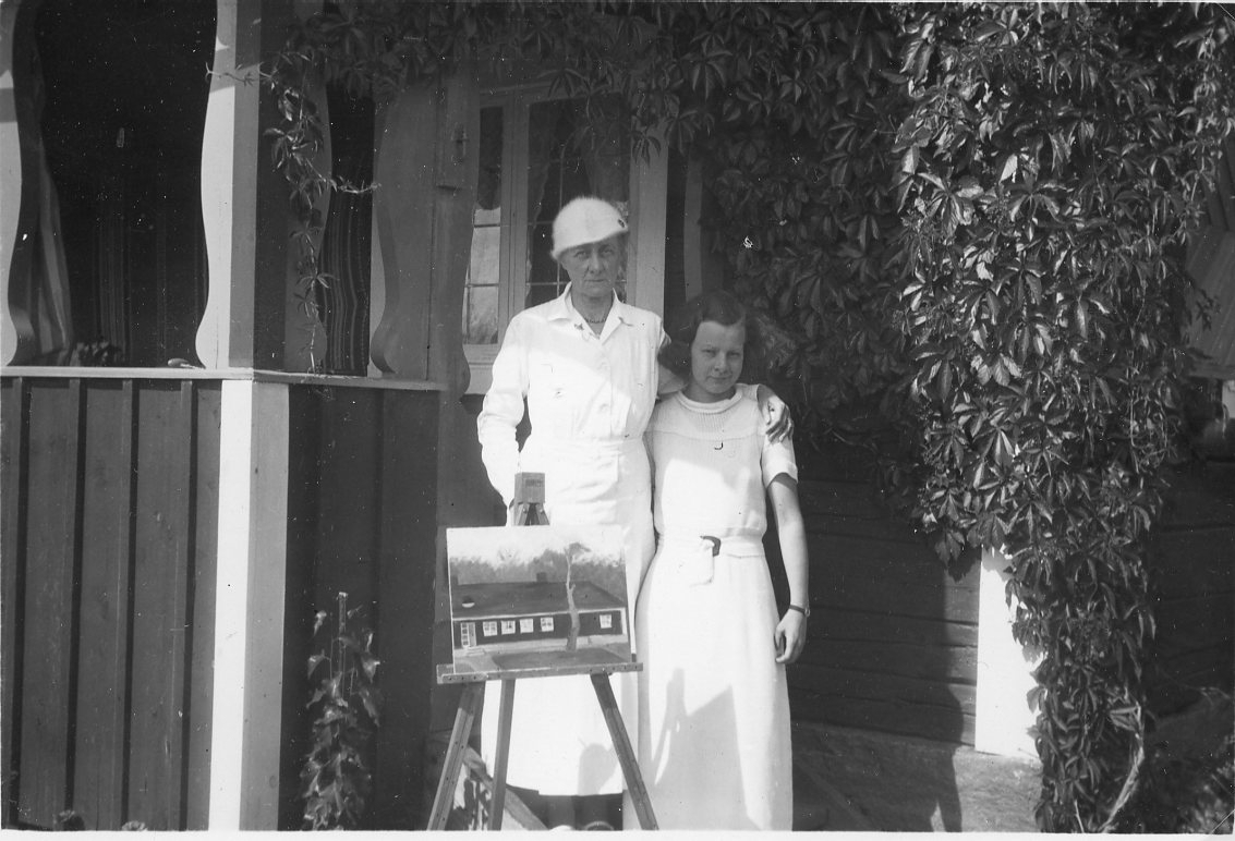 En äldre kvinna i ljust med hatt står med en ung kvinna tätt intill sig, hon håller sin arm om henne. En tavla med ett hus står på ett staffli framför dem.