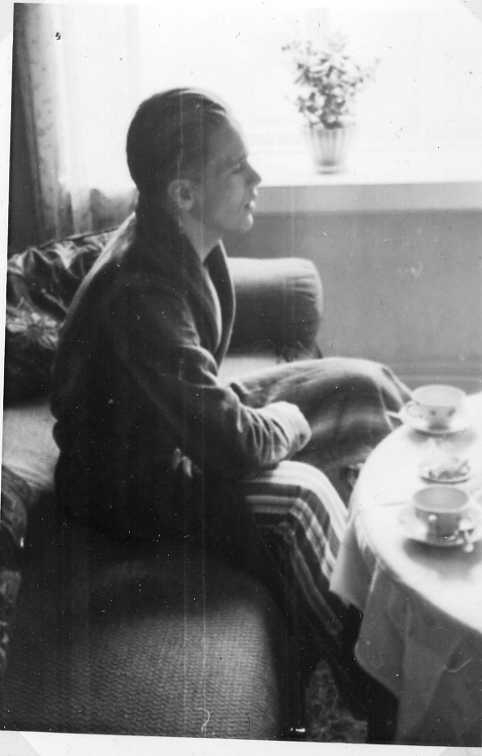 En man i profil sittande på en soffa i vad som ser ut att vara pyjamasbyxor och morgonrock. Framför honom ett runt bord med duk och två kaffekoppar och ett askfat.