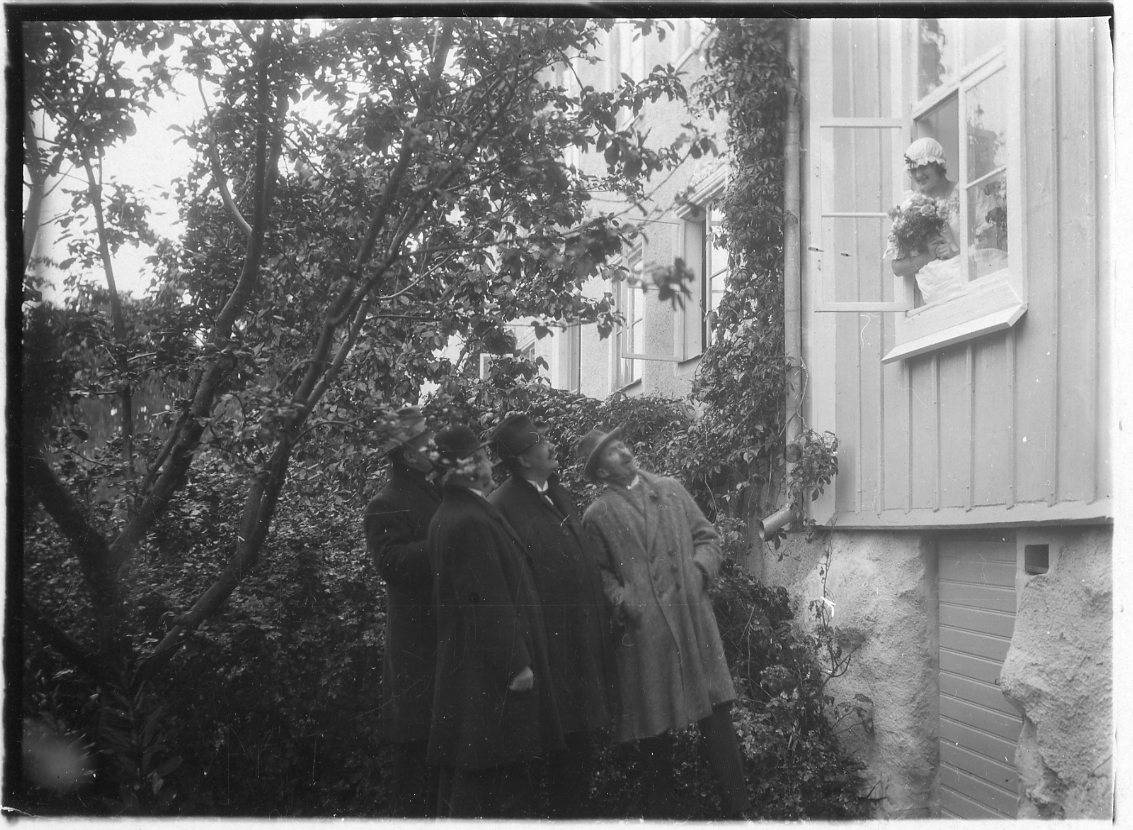Fyra män står utanför ett fönster och sjunger - sannolikt. En kvinna med nattmössa och en blomsterbukett i händerna sitter på fönsterbrädan och tittar ut.