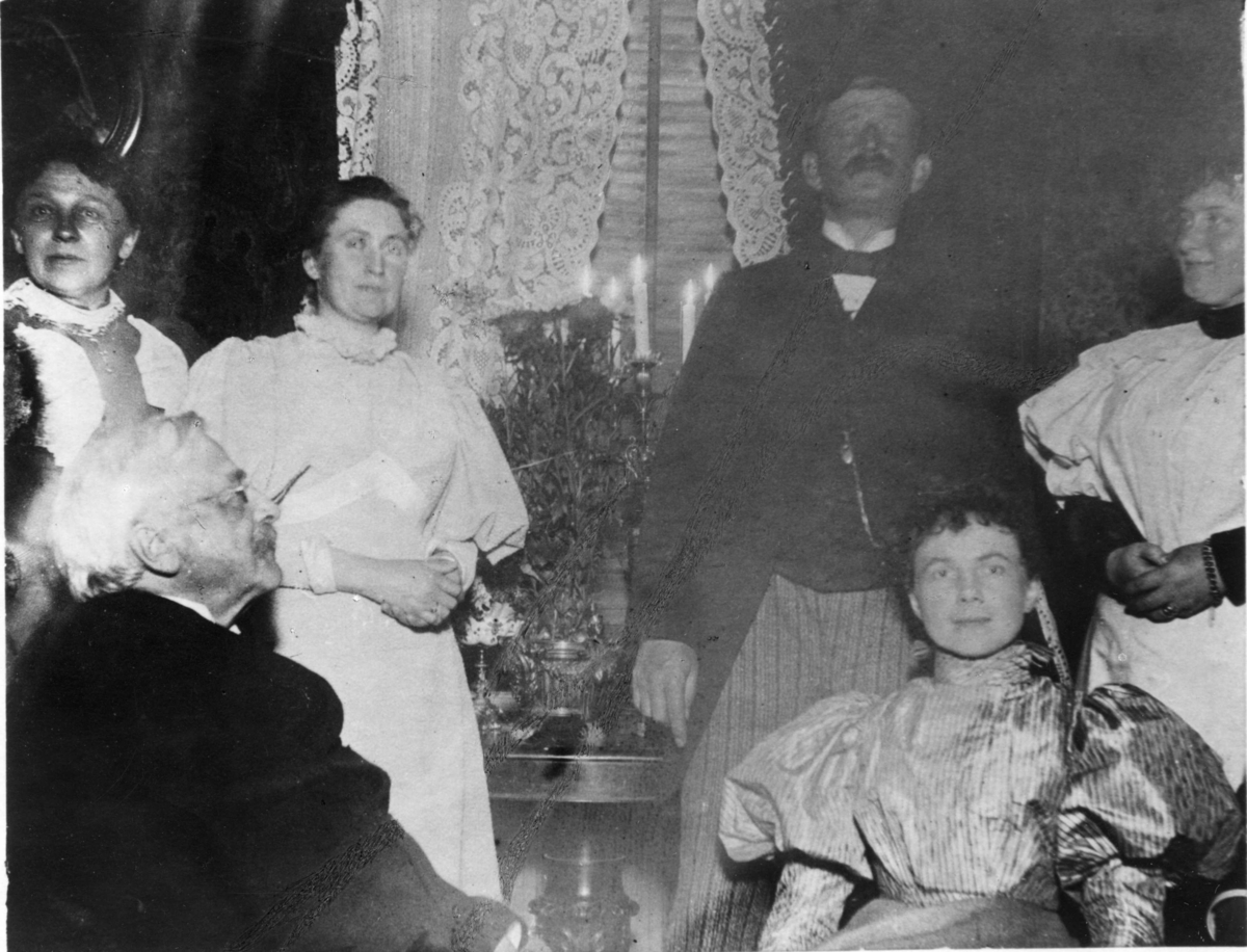 En interiör på okänd plats med stående från vänster: Minchen Leche, Gurli Linder, S A Andrée och majorskan Kinberg. I förgrunden sitter i profil A E Nordenskiöld och intill vänd mot kameran Hanna Palme.