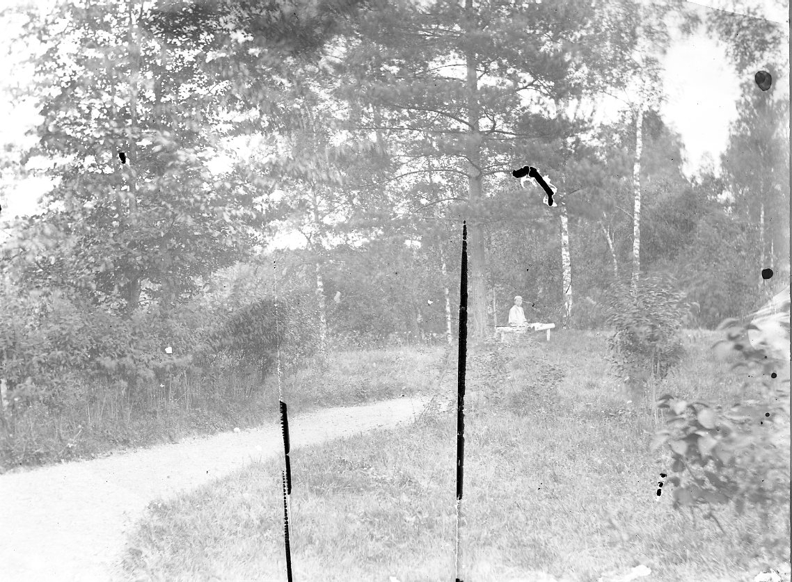 En pojke sitter på en bänk i bortre änden av stig, troligen i en trädgård.