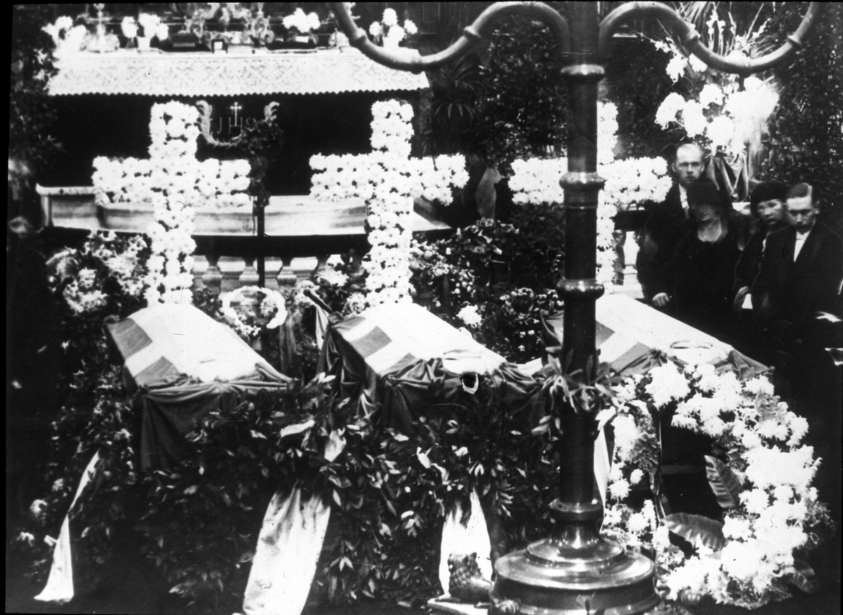 Andrées, Strindbergs och Fraenkels kistor i Storkyrkan, Stockholm. Diapositiv, glas.