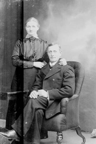 En kvinna står intill en man som sitter i en fåtölj. Hennes händer vilar på hans axlar.
