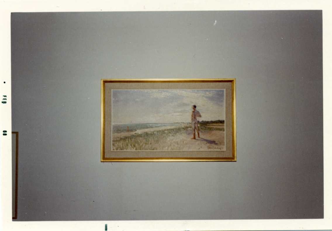 Fotografi av oljemålning av Pelle Malmborg som hänger på en vägg. Den visar en naken man vid en vidsträckt sandstrand. En annan person är i vattnet.